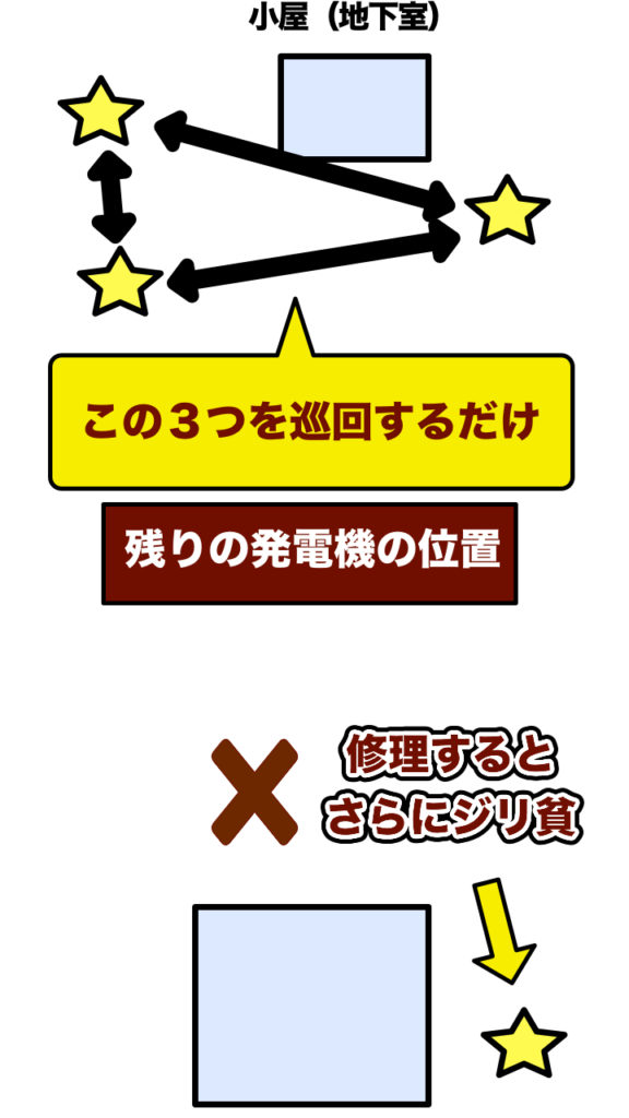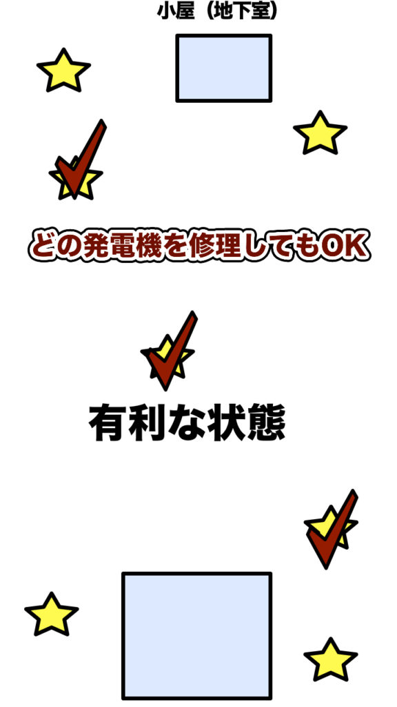 裏を返せば、発電機の修理を間違った形で完了すると、あとでジリ貧になって全滅します。